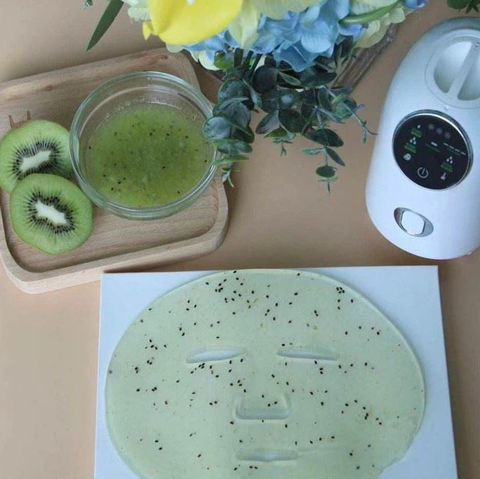 Basta preparar 20 ml de sumo de fruta (ou outro líquido), misturar com água (e colagénio, se quiser), colocar na máquina e em 6 minutos a máscara fica pronta. Depois é só despejar no molde e esperar 2 minutos para solidificar.